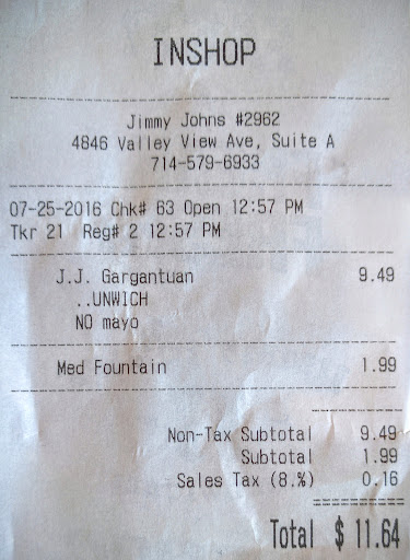 Read moreIt was my fiance Don's very FIRST TIME at Jimmy Johns. I've loved you guys since 2001 wayyyyy back in Alexandria, Minnesota. After a little hesitation and finally finding a store that was close and open we FINALLY made it thru the drive thru of Jimmy Johns!! I am happy to report he loved it just like I do!!! Unfortunately, Don has fallen so ill due to extremely bad asthma and asthmatic attacks!! I've been out of work to care for him and it's been hard on both of us. If I were still working I'd bring him JJ's every night or every day for lunch but I just can't afford it right now. Thanks for making a day we had...