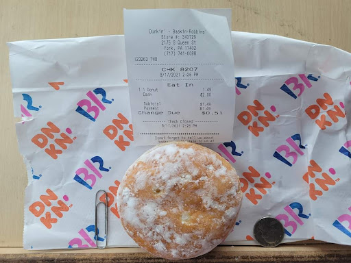 The paperclip & the quarter in the picture are there for size reference. The receipt is there in case you don't believe me on the price of this ONE donut!!!! As well as to document the date & time, should the business choose to correct anyone's behavior and attitude.