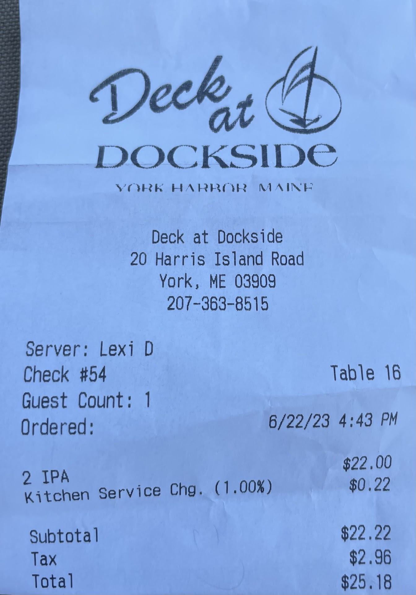 If you want an $11 beer served in a plastic cup this place is for you. The first trick is they list no prices on the drink menu so if you don’t ask you will have a big surprise when the bill comes. I do agree that the view and atmosphere is nice however there are so many other places along the York coast that offer as good or better views with reasonable drink prices. Many of them also have Happy Hour during certain hours and days of the week. So again, if you like paying $11 for a beer in a plastic cup definitely check this place out they will be glad to...