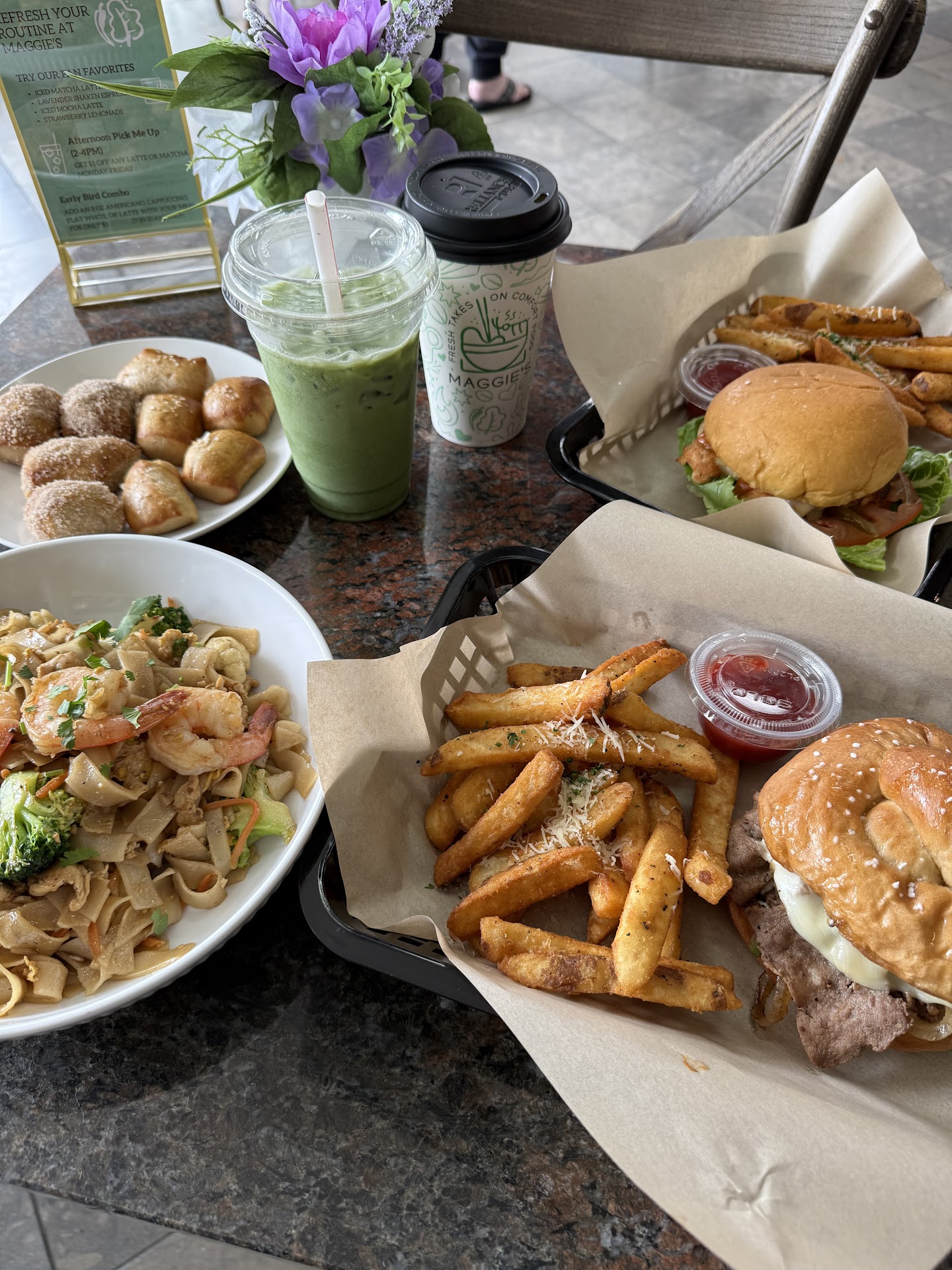 Ā Ā Ā Read moreWe got a cappuccino and a Thai tea for drinks and they both were delicious! The fries, chipotle chicken sandwich, and chicken salad sandwich were all amazing as well. The chicken breast was extremely juicy. The vibe in the cafe was very relaxed and cozy. The staff was hustling quickly during a very busy surge of guests. From what it looked like, there were only 3 employees working. Due to the busyness, we had to wait a little longer than desired for our food, but it was to no fault of the employees as you could tell they were trying their hardest to get the food and drinks made as quickly as possible. My only recommendation would be to hire another employee or two to help with the...