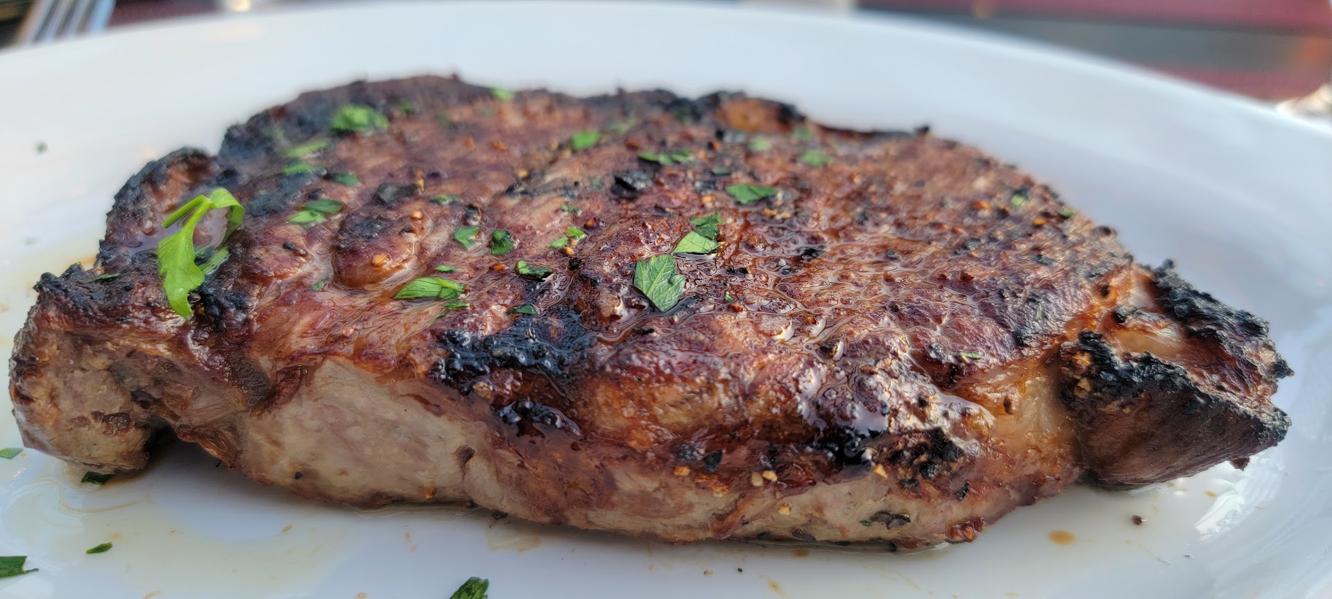 Once I finished my starter the waitress removed my plate promptly and then gave me a knife for my entree. When it arrived I knew I was in for a treat, a 14oz rib eye cooked medium rare with an au provie demi on top. And a side of mashed garlic potatoes. Let's get the zero out of the way, the potatoes where very underwhelming. They just tasted like very boiled potatoes that lacked any salt and it was way over whipped without any texture at all.