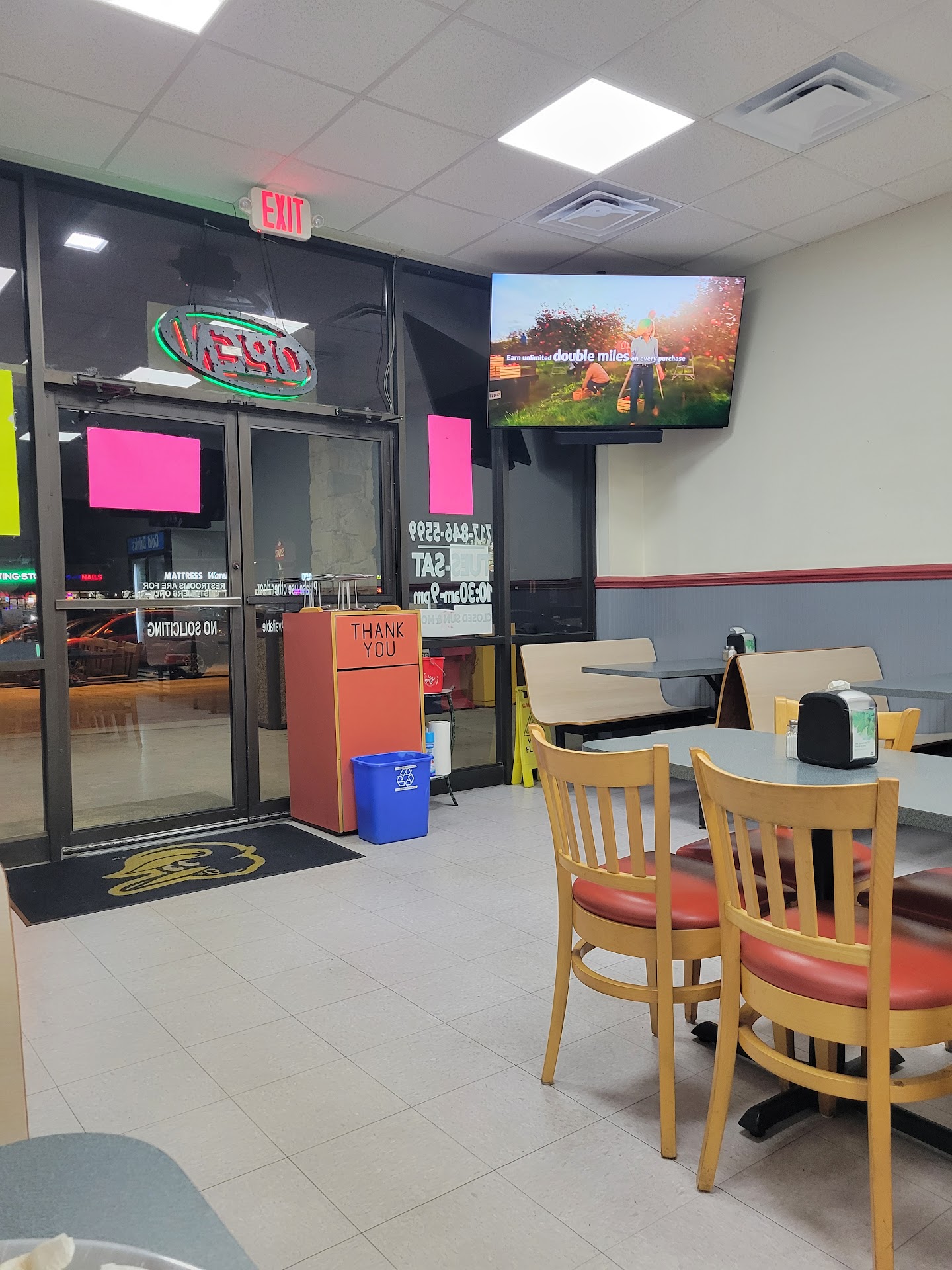 Each time I go in some seemingly ridiculous change is being made to the restaurant. First it was blinding lights and now the paint job looks like it was done by a child.