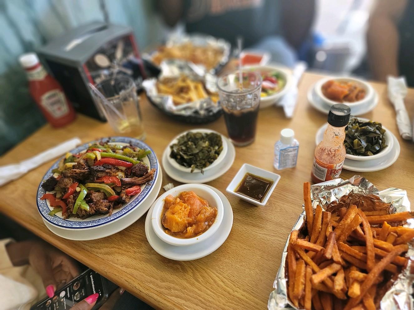 My boyfriend and I stopped by on a whim today, 1st time customers. We were greeted by a very friendly young man who sat us right away. They clearly are practicing social distancing guidelines, as all the other customers were seated appropriately. The decor is sweet and welcoming, there are lots of TVs, and even what appears to be a small stage for possibly some live music or even a comedy night? Covid permitting, that is. Anywho... My boyfriend and I were narrowing down our choices (we are mainly pescatarians , but will occasionally have meat) so I asked the host about the specials. He said they just put a salmon cheesesteak on the menu. Salmon cheesesteak? You mean like a Philly, but with salmon? He confirms, and says it comes with fries. He went on to say itās so good heās been eating it for the last three days. Hmmmm... I also ask for some coffee, to which he replied they donāt have any, says that people like their coffee all sorts of different ways, so they stay away from that. I said well people like their food all sorts of different ways, but you donāt stay away from that! He laughed a bit, knowing I was just messing with him. I am a big coffee lover but I can get over it not being offered. Especially since their food is... well... worth every calorie and red cent! I realized I had forgotten to take my insulin and I left it at home (something I NEVER do), so I knew I had to be careful with my choices. I asked our server if they can make the salmon Philly without the bread, he gave me a look but once I explained why, he understood. He asked the management, who was sympathetic to my forgetful mistake, and said they can do it without the bread. So I ordered that with a side of greens instead of fries, and my boyfriend ordered the fried whiting with cabbage and seafood salad. The food came out in a timely manner, and the server brought us all the necessary condiments and water refills. I had a HUGE helping of salmon, broccoli, peppers, onions, provolone, and their special sauce on my plate. The boyfriend had several pieces of whiting in front of him. He tried the seafood salad, which he said was good but a bit salty for him. But he then tried the cabbage and said it was delicious! I tried his cabbage and LOVED it! Perfectly peppered! He tried his fish and started nodding. He then sat back and said he may have to stop making his own fried whiting at home. Now if you only knew how frugal this man is... for him to say he might as well stop making something at home and just get it from a restaurant?!??? Stop. Call the press! Well anyway, once I started eating my salmon Philly without the bread, I could not stop! Those two young men really sold me on it, and they were not lying! The boyfriend tried it and he nearly lost his mind! He asked the server where we can find someone to smack, it was that good. Needless to say, there was none left to take home. And the greens? Perfectly seasoned! Got a lil Turkey in them, but I didnāt mind! Delicious! We will definitely be returning, Iāve got my eye on some of their soups and he wants that Turkey wing. I have a feeling thereās not a bad item on the menu. We only live a few minutes away so we will be returning soon!...