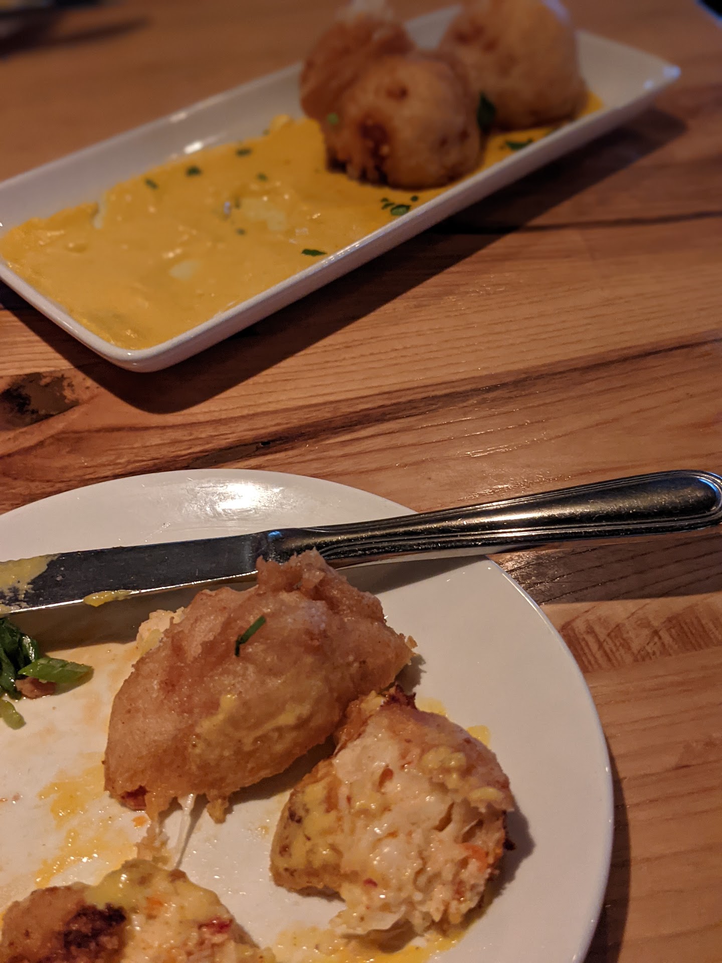 This was a fantastic surprise. I happened to be in the area, and found this restaurant on Yelp. Glad I did! My dinner guest and I loved the place before we were seated. Great decor, terrific lighting, and the kind of casual and relaxed atmosphere that makes you want to stay a while. Our server, Niki, was super-friendly and helpful throughout our meal. We ordered several sides and split a burger. First out were the meatballs. Three giant meatballs covered in delicious sauce, cheese, and pesto. Tender, savory, perfect. Next up was whipped feta with honey and dates. Pita triangles were used to scoop up the feta, and the combination was amazing. Like savory Greek yogurt, but better! The fried Louisiana fried shrimp were fantastic, served with a mango chili dip. The truffle fries were hot and crispy, perfectly seasoned (generously) with intense truffle flavor, and served with a fabulous garlic aioli. We chose to split the pastrami burger, which was incredible - familiar flavors all pulled together into one delicious burger. I have a feeling this is a gem for locals around York. If I lived here, this would be a regular go-to place for me. When the check came, I thought they made a mistake; for the quantity and quality of the food, this was an absolute bargain. Truly one of the best meals I've had in a long time, and you can't beat the ambiance and service! If you're near York, Maine, do yourself a favor and stop in. You won't be...