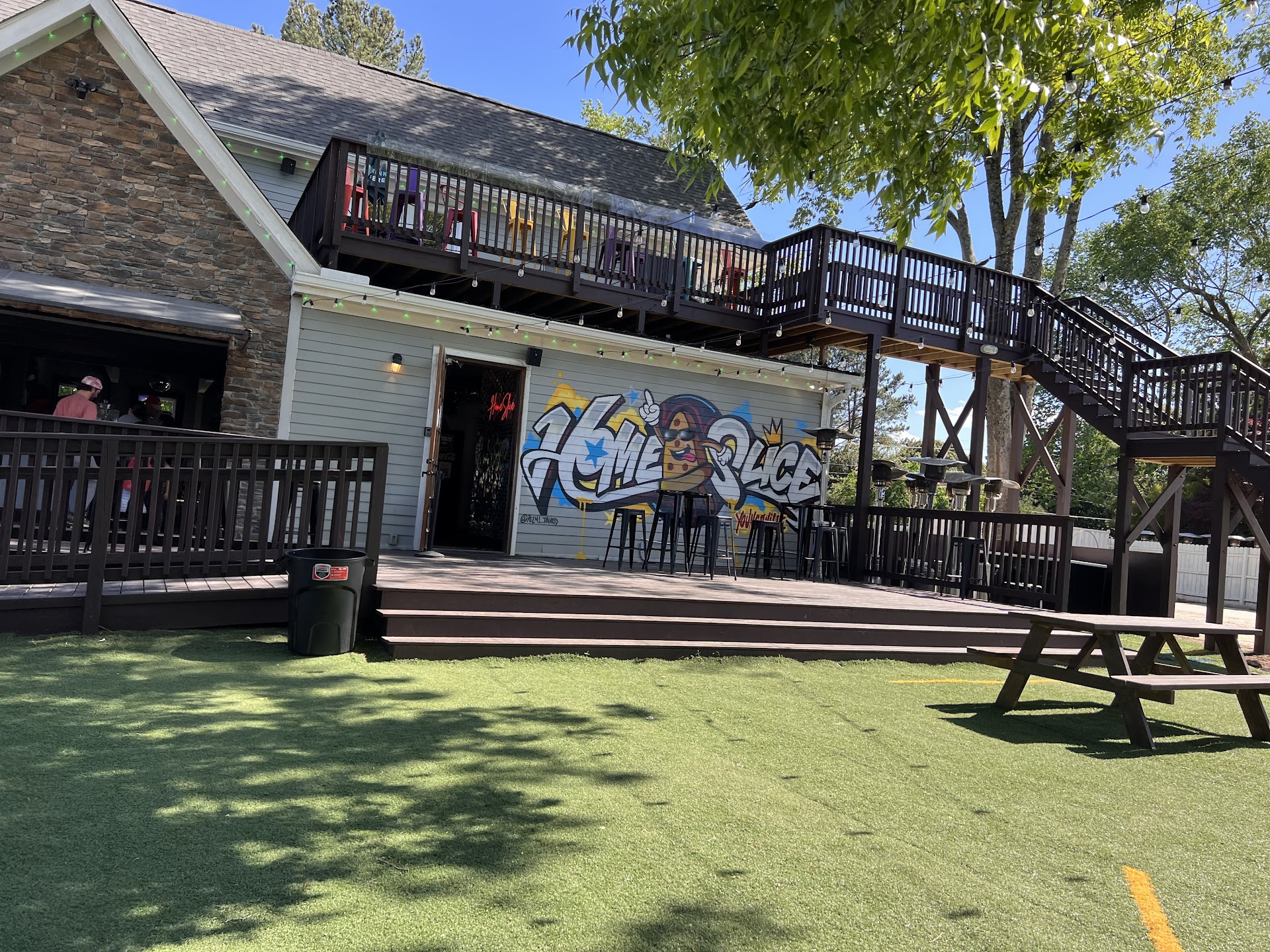 They have a huge outside area with a lot of seating. There's even a balcony area to look out over the outdoor area.