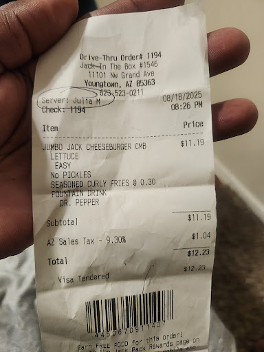 Read more28 Aug 2021. Not happy today. Came in to try the new bbq bac dbl cb cmb. The service sucked. Kid with a goofy haircut attempts to take my order. I pointed to the ad for the burger but said I wanted the double not the triple. He says "what size?" Again I say "the double." He says "just the burger?" "No, I want the combo." Again, 4 or 5 more times he asks "what size ?" I'm thinking about walking out. A female from the back says "just give him the small." To change the situation I ask "what is the difference?" He rattles off all the price differences. I'm thinking "omg, why me?" After a long day at work I just wanted to try the latest combo from Jack in the Box. While I'm waiting I want to wash my hands so I ask for the combo. A female screams out 151. I go and try that only to find its not the correct code. Again, rather than speak to me with any respect she yells 5151. Once I finish and return to the counter that same guy yells "415" while looking at me. I ask is that mine? He says "Yea." Why couldn't he just say "your order is ready." These youngster you hired have no manners or respect. After today, I won't be back.