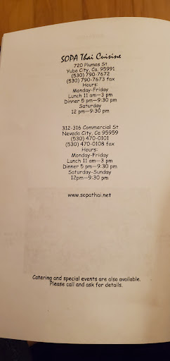 Ok Yuba City location, so not authentic tasting or even looking Thai food to begin with. Waitress was friendly and nice to get that out of the way. Food was out quick, but I was the only person there during lunch hour. My wife and I had eaten here maybe 8 yrs ago and swore it off as worst Thai food in the area. We have always recommended anywhere but here when people ask about Thai food. After hearing some people mention they enjoyed Sopa Thai, I decided to give it a shot again. I got chicken Pad Thai, medium spicy. Staple Thai dish, should be spot on. Nope, it came out and smelled unpleasant, taste was unpleasant and didn't represent Pad Thai, didn't look like traditional Pad Thai either. Had zero, absolutely zero spice. It looked like they used pizza hut pepper flake shaker to attempt to add spice. It was chunks of pepper flake stuck to noodles and added no spice. Chicken was rubbery. I just do not know how anyone can rate this place highly if they've ever tried Thai food before. I asked about if it had changed ownership recently, hoping that it wasn't the same person making the same mistakes from years ago, and it is new owners with still no idea what Thai food is. Honestly just flabbergasted at how abysmal of an...