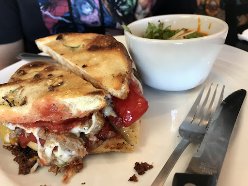 Read moreA hidden gem in yucca valley. A hidden gem indeed. This amazing restaurant is behind KFC. When I first came in this restaurant, I was welcomed with such a warm hello. I have a feeling that he was the owner. When you look at the menu, you can tell that they based their restaurant on a music theme. All of the names of their food is a music title. Their restaurant has a cool pizzeria vibe. I ordered an individual pizza and a Morrison for dessert. My husband ordered the go with the flow sandwich. It has peppers and sausages with a red sauce. He also ordered a cheesecake with a caramel drizzle. They used the same dough for their desserts like the Morrison and looks like their sandwiches as well. My pizza crusts was really good. I ordered an individual pizza so I can put my own twist on it. Sausages , portobello mushrooms and pineapple is my jam. The tastes of my pizza has this sweet and tangy taste because of the pineapple and it was great. My dessert was amazing. I am not into sweets and this was so good, I didn't finish it because I want to take it home. My husbands sandwich was huge in a way that he couldn't eat it as a sandwich. He had to it with a fork and knife. It could get away as a open faced sandwich actually. The cheesecake looks like it was homemade. The crusts was a little too thin but that didn't bother my husband that much. I would recommend this hidden gem. Bring family and friends. Bring lovers and enemies. It is very good. And if you dont want to go?, and you live in Yucca Valley?, what do you know?, they deliver! Not in Yucca...