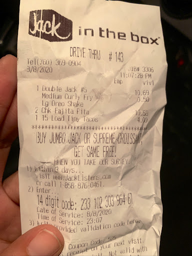 Read moreThe only thing to explain my experience would be the saying once said by a wise man. “My disappointment is immeasurable and day is ruined.” To start off, they got my order like REALLYY wrong. I ordered 3 sandwiches (2 combos) and a few other things. I was really hungry so it gravely upset me when I saw that not only were the 2 combo burgers wrong but there was a burger missing which was for my little sibling. You can say “its petty” that i’m mad but hear me out ok? Both burgers (Both fries were missing as-well) were not only wrong, but insanely old. The patty was shrunken as-well as had a distinct visual than advertised, plus it had a sort of foul taste to it (They told me they had a good cook when I called to complain). I now have a annoying stomach ache and am facing the consequences of trusting these people with my dinner. So do I suggest visiting Jack in the box? Yeah it’s a great fast food place…. Just visit another location if you don’t want to be as disappointed as I am, Thank you...