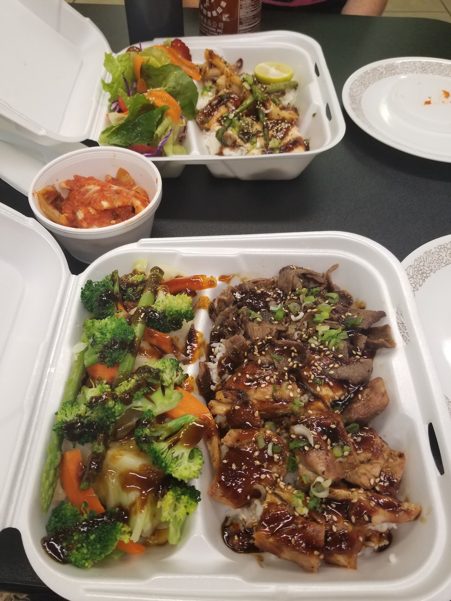 We shared: Salmon & shrimp plate with salad & house dressing -- fresh & tasty, highly recommended Chicken & beef plate with veges -- chicken was good, veges were good & the beef was OK but kind of stringy & chewy/more like beef jerky Small kimchi -- tasty & spicy, highly recommended