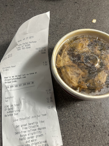 Read moreGot into Chipotle at 8:50 or so today and walk into a huge line not uncommon to find. What was uncommon was a single worker a younger woman working the food line with no employees in sight. As I continued to watch there had been an incident outside that was being taken care of. But 10 minutes later I am still in line and this girl is doing everything on here on suddenly 4 staff members walk out laughing having a good time and not a single one offered to help her out. When It was finally my time to order at around 9:12 there was a sign that stated they were out of chips and lettuce not a big deal. By the time I got to the meat they were “out” of every meat but barboca and carne asada. Since when did restaurants stop preparing or doing anything an hour to close? Not a huge deal I get the carne asada and when I get home the meat is cold and dry little to no flavor and the pico and green salsa were not fresh. Yes I went in at 850 an hour and 10 minutes out from close but the sheer unprofessionalism and complete disregard to customer service will keep me from coming here...