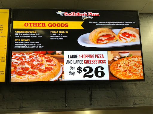 Read moreGodfathers Pizza is amazing. But.... This isn't exactly Godfathers. No jumbo pizza, no telephone number, no coupons, it's a truck stop with Godfathers Pizza. Walk up, place your order, pay full price preferably with a card. Go wait in your car for 20 minutes return and get your pizza....