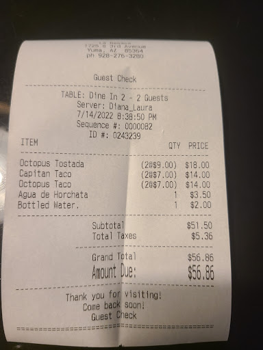 Read moreI was excited to try this restaurant after their extensive renovations. When I first entered I was greeted with an awful sewage/fish smell that only lasted while I was in the entrance. There was wonderful live music and the inside of this restaurant is beautiful! Since I love octopus I ordered: grilled octopus tacos, shrimp govenador tacos, octopus ceviche, a horchata and a water. (They charge $2 for water) The grilled octopus tacos were cooked perfectly however they were spicy. The shrimp gobenador tacos were not my favorite because they were over cooked and extremely spicy. Beware of the high spice level for most of their dishes! The octopus ceviche was good but the octopus did not taste as fresh as the grilled octopus tacos and was a bit slimy. However I enjoyed my overall experience and the live music was a plus. I will be...