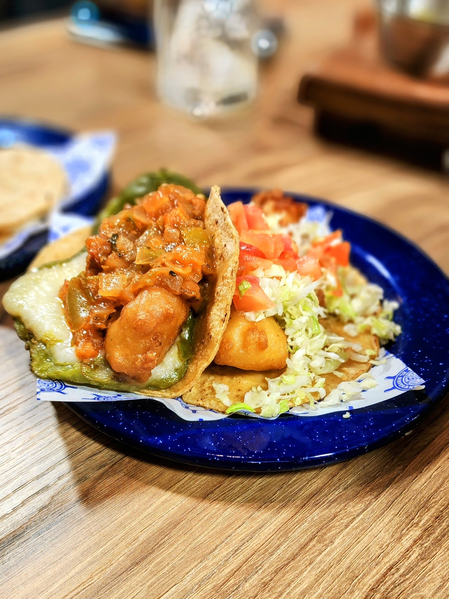 So far all I have eaten are the fish tacos and the shrimp tacos and I have to say they are the best I mean THE best fish and shrimp tacos I have eaten. Large shrimp that actually taste like shrimp and large portions of fish that actually taste like fish and all cooked perfectly... and so many different sauces to choose from... my favorite ones are the green one and the orange one...I think it's orange... anyway, it's on the table in a squirt bottle.