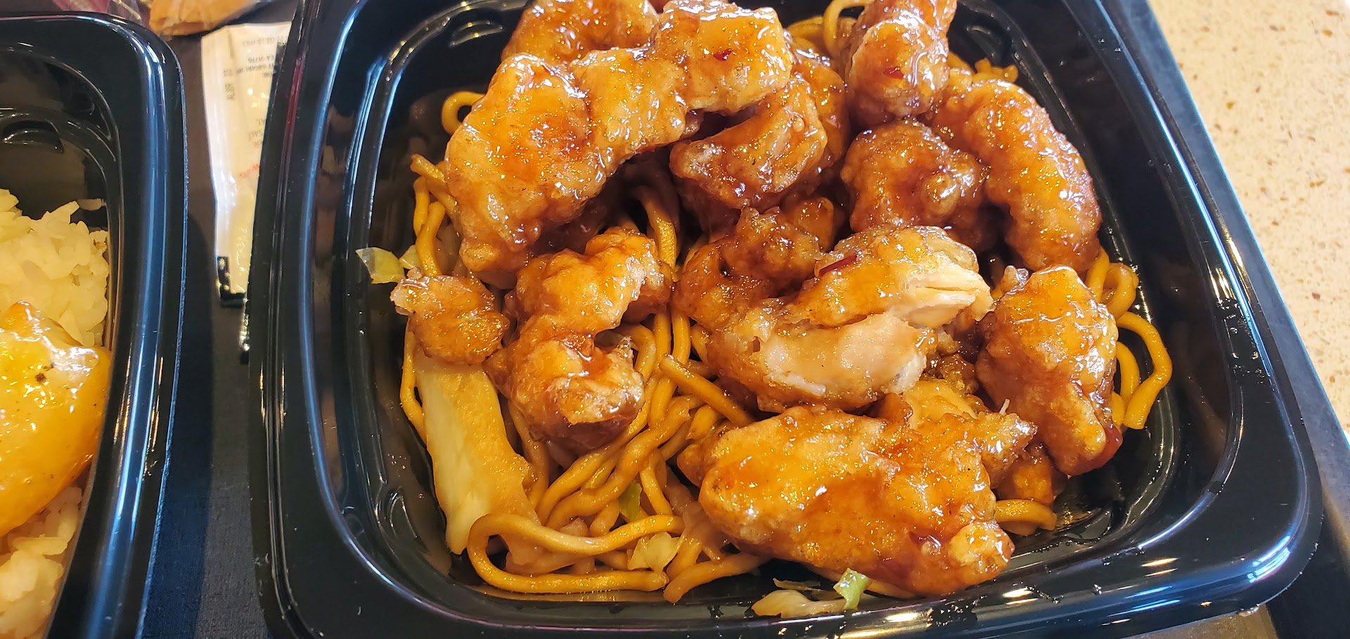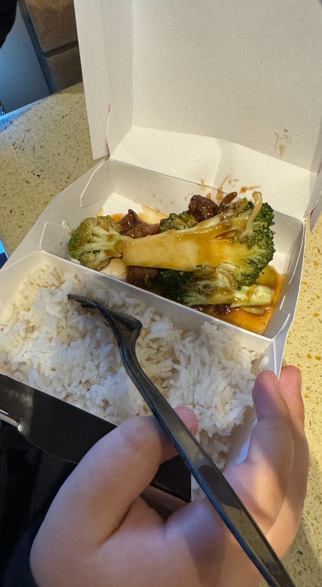 When we open the box.. The beef and broccoli had literally all broccoli! Giant chunks of broccoli and maybe one tiny piece of beef. Good thing we opened it right there in the parking lot. We went back through the drive-thru and told them about the issue and they gave us a small box of just brief on the side. Very much appreciate the service!