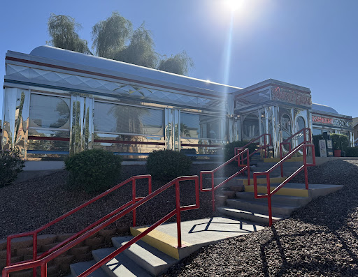 Wife and I Stopped in on the way through yuma, the food was bad at best. When we walked in there were 2 other groups sitting and eating. They left within 5-8 minutes after we arrived. We ordered our food which came to the table in waves. I was half way done eating by the time my wife's food came out. The other 2 parties had left and we were the only ones in the place. As we finished our food another couple came in and sat down, 10 minutes later they got up and left due to no employees being anywhere to be found. They were never greeted nor did any staff members ever once appear in this time span. My wife and I sat for close to 20 minutes wanting for our bill. Finaly after yelling "hello" multiple times into the back area of the place someone came in from the back door and helped us pay our tab. As we walked to our car we saw all 3 employees sitting at a park bench outside the back of the restaurant. Like they were having a day at the park. As for the restaurant itself, it was filthy, the blinds were nasty dirty, and the floors looked like they don't own a mop or broom. The decor, well it's your typical diner trying to imitate an old 50s diner, and doing a poor job of it at best. As for the staff, well don't you dare bother them while they're at work because as a customer you're just in their way and an annoying person who wants some food from their restaurant. And you better not even think about getting a refill on your iced tea because that's just not going to happen, it would require a an employee to do their job, which doesn't happen here. As for would I recommend this place, not a chance. In fact it's quite the opposite, I would recommend you don't waste your time with this place. The food was not good at all, the service was non existent and when we did see an employee we were made to feel unwanted and in the way.. the service was so bad that on the tip section of our receipt I didn't write in a dollar amount for a tip, I instead wrote " tip, bet the 5 horse in the 3rd race" The sad part is this place has great potential due to its location and proximity of the freeway and all the local hotels. Unfortunately they have the laziest , rudest, staff I've ever encountered.. DONT GO EAT HERE YOU WILL BE...
