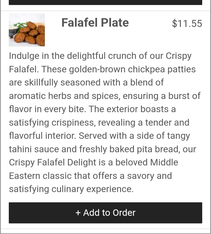 I ordered Gyro and chicken wraps, which were supposed to include pita bread, but instead, they were wrapped in tortillas. During my last online order this afternoon, as I picked up my order, I specifically asked the staff whether my wraps included pita. I was informed that I needed to specify that I wanted pita because the owner changed the policy without updating the menu. It is completely misleading that the menu states Gyro wraps come with pita and lentil soup, yet this is the second time I have received takeout missing the correct items.