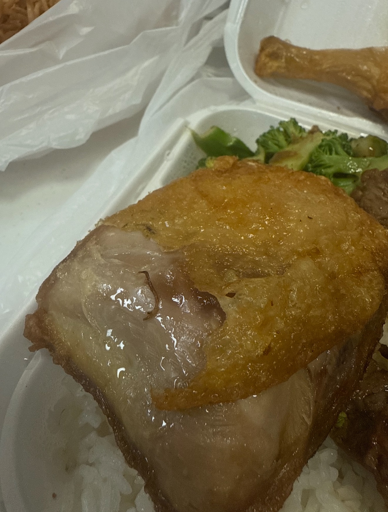 NOTHING, I mean N-O-T-H-I-N-G TASTED like it should. Never thought you could mess up Gen Tso's. The breading and aroma smelled OLD on both orders. I reluctantly took a few spoonfuls and just threw it out. "Egg" rolls were just pastry skins fried in the shape of a spring roll. Nothing inside them. Pork fried rice had pieces of under cooked pork with fatty parts and tendons...ughh GROSS.