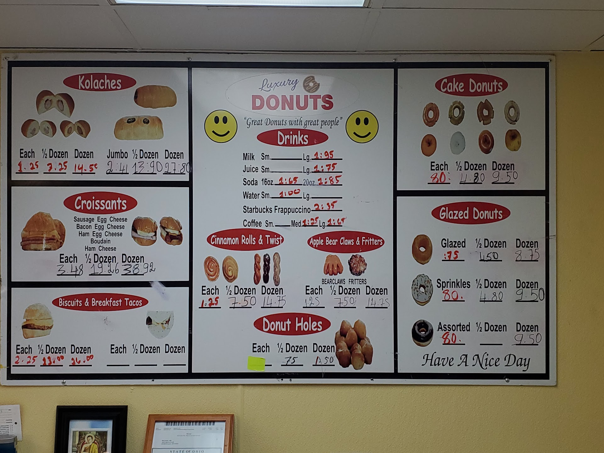 I was shocked to find they have Kolaches. I haven’t seen those since I lived in Texas. Get the jalapeño sausage ones! Then there’s the bear claws, the various jelly-filled offerings, and my baby girl loves their cream-filled heart-shaped donuts.