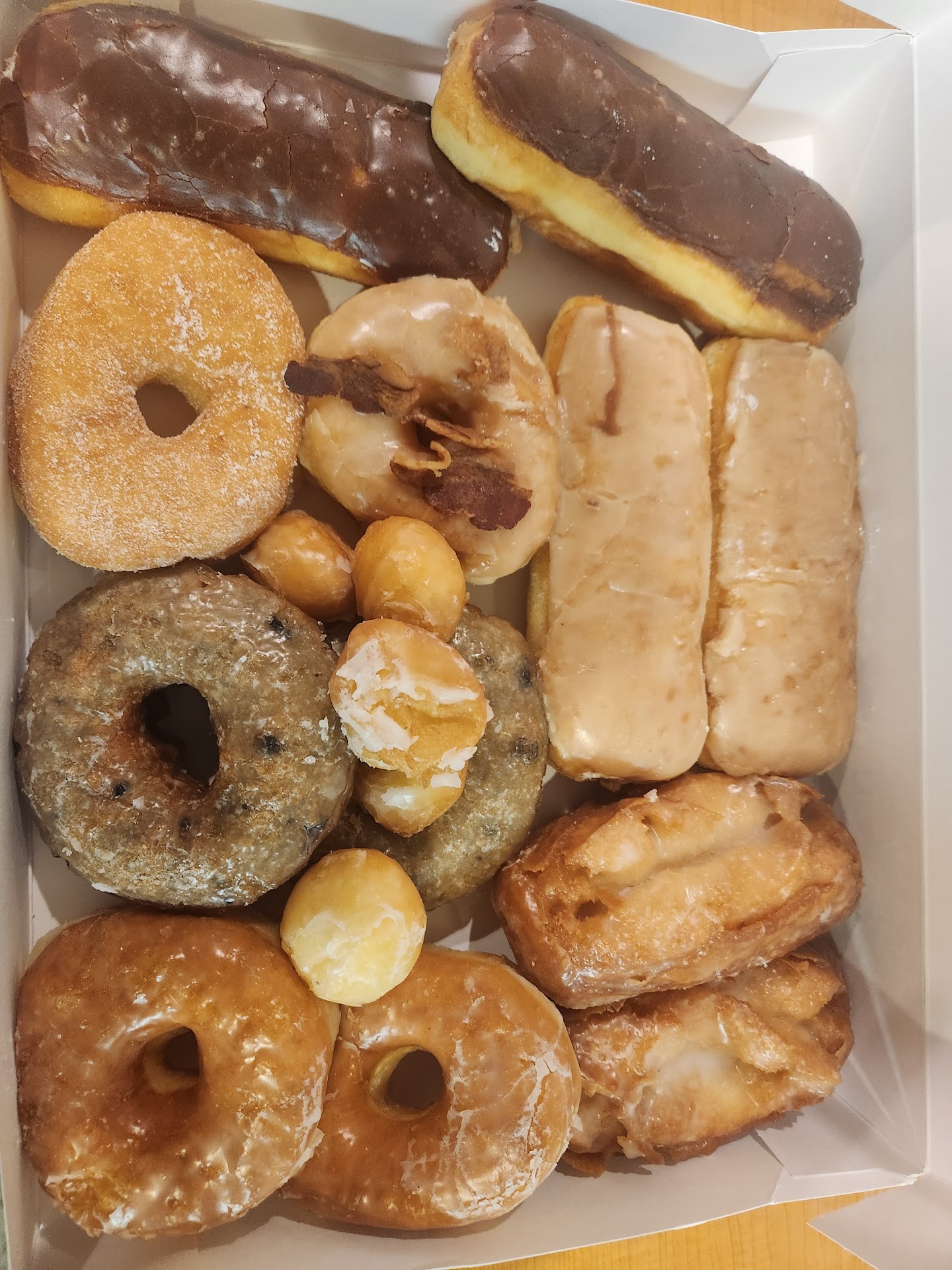 THE Chocolate Donut w/Glaze. This is the new shop in Zanesville for Donuts that just opened. As a Google guide, I been waiting to get to the new Happy Donuts to try them out. I grew up eating Darrel's donuts as I lived around the corner. I have had Donald's oftens too. I preffer Darrel's unless I'm getting a sticky pecan bun from Donald's. Donald's is not making those at this time (no oven) that was a over a month ago. THE REVIEW * The lady was nice I ordrered my donuts and asked for the apple fritter to be cut in half. She said no problem. She tossed a little something in my bag. She said, " I put a chocolate glazed donut in the bag for you." Wow thank you. Actually it was an evil plot, so I start trying them out splitting em half with my daughter. Then I get to this chocolate donut w/glaze. It's light, airy, with a perfect crisp glaze. It's not an overwhelmingly chocolate donut, with the color of like a wheat bread in color but lighter. This chocolate flavor is just right. This donut, is wonderful tasting and perfect. It's one of the best donuts in town. So, I'm out running errands and return like 20 minutes later to buy a box of these crack infused donuts.