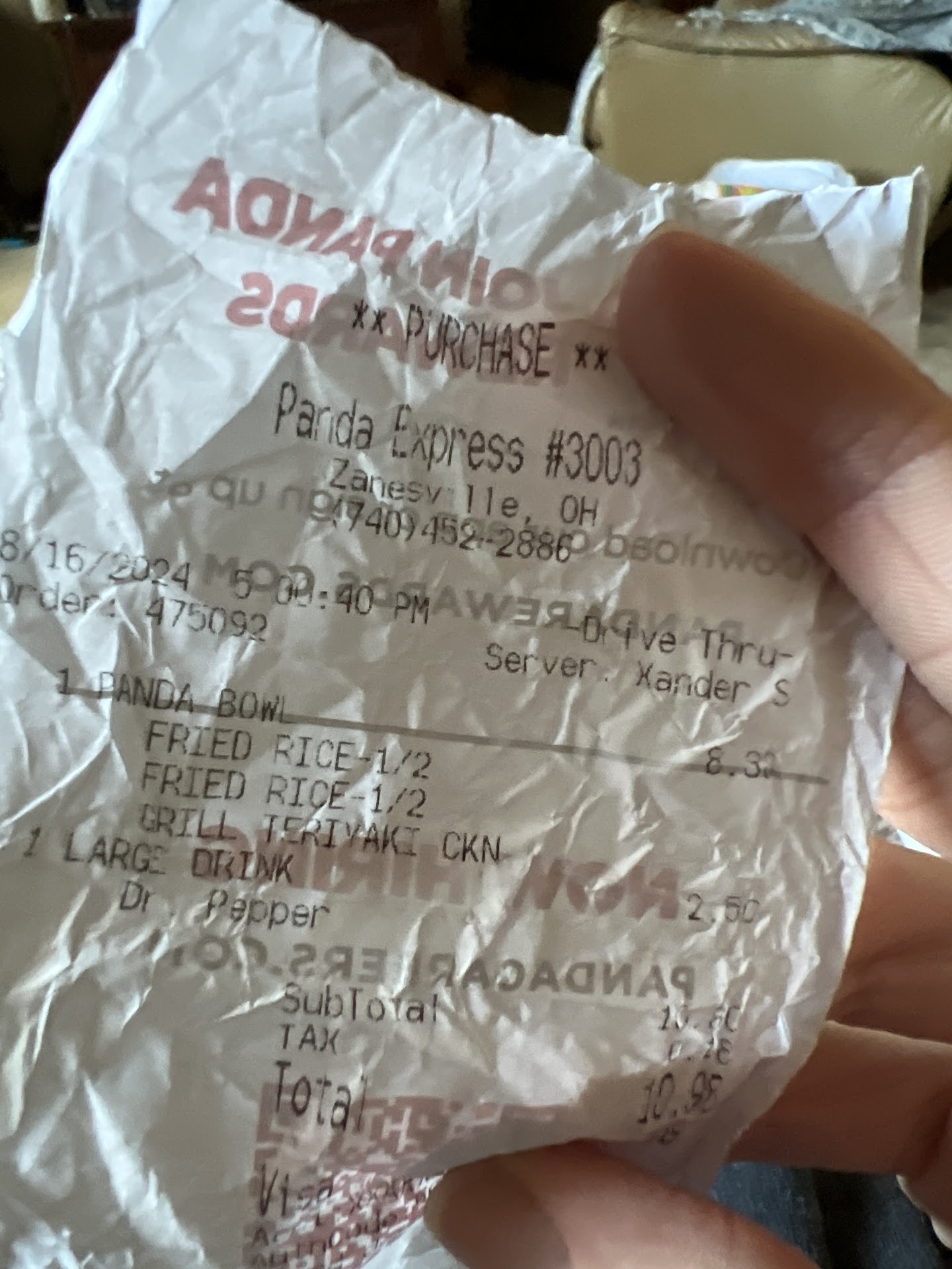 This was our first time ordering from Panda Express and we ordered through Grubhub. We've used Grubhub before without an issue so assumed everything would be fine. We also realized that with the dining areas being closed our order would take longer than the typical 25-30 minutes. An hour and a half passed and our order still hadn't arrived, we called and were told rather rudely that Panda Express doesn't deliver. I explained the Grubhub situation and the phone was given to a manager. This manager assured that the driver was most likely waiting in line and that our order had been done and sitting there for almost 2 hours. Trying to be patient I agreed to wait, but by hour 3 another call was made to which we were told there was still no pick up and if we wanted to cancel we would have to go through Grubhub. Ok, fine we decided to go pick our order up. Yes the line was long but not long enough to warrant a 3 hour wait. After a brief argument someone brought our order out to us. We got home and opened it (beef and broccoli with chow mein noodles and fried rice, orange chicken with fried rice, walnut shrimp and orange chicken with fried rice and chow mein noodles, egg rolls, and cream cheese rangoon). The order was correct but the orange chicken was extremely spicy, neither the fried rice nor the chow mein noodles had flavor, and the egg rolls were somehow oily and burnt. I had high hopes for this restaurant but sadly it didn't live up to my family's expectations. and as a side note stick...