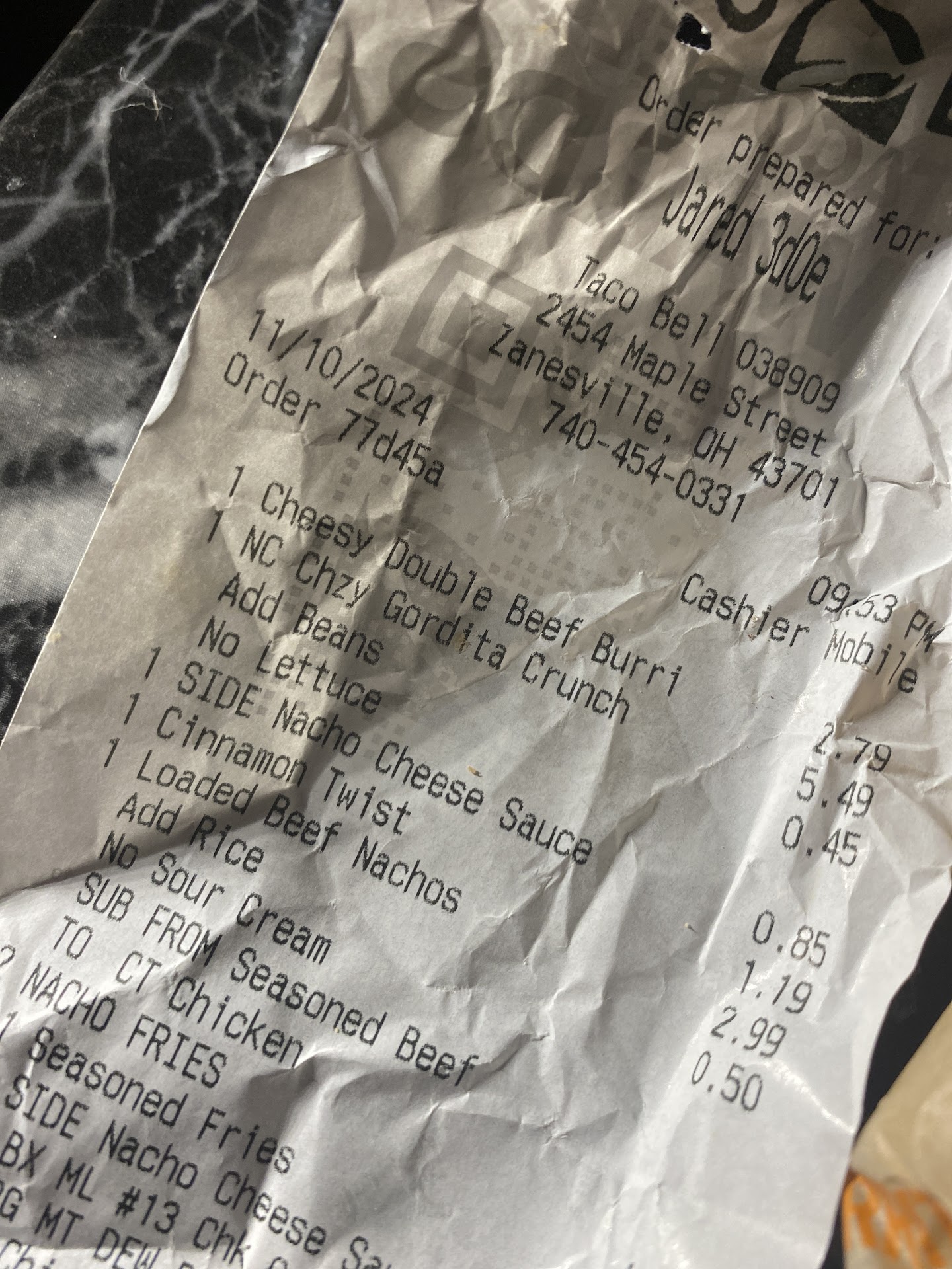 Read moreI don't often use a review to rip into a restaurant. In fact, I've never done a "one star" before because there's typically something good that can be said. Not this time. It was going on 7 PM and I was in a hurry but had a serious craving for a chili cheese burrito, so I patiently waited the 10+ minutes I spent in the drive-thru line. When I got to the speaker, a couple more minutes passed until a voice finally (with no apology) asked me for my order. I asked for two chili cheese burritos, a chips and cheese and a large Diet Dew. I had to repeat each individual item two to three times, with large gaps in-between. He clearly was asking for my order and then not paying any attention. Several minutes later, I made it to the window and, in a minute or so, I was handed my order without the guy acknowledging me. He didn't say a word. Even my "thank you" got no response. I parked, unwrapped a burrito AND IT WASN'T HOT. IT WASN'T EVEN WARM! At best, it was at room temperature. And my $2.59 chips & cheese? The cheese container was barely half-full! The drive-thru line was even longer than before and, since I was already running late, I didn't have the time to ask for it to be done correctly. Without a doubt, this was THE WORST TACO BELL EXPERIENCE I HAVE EVER HAD! And besides being a disappointment, food being served at a temperature like that is a health hazard...and the Muskingum County Health Dept. should be made aware that the food is clearly not...
