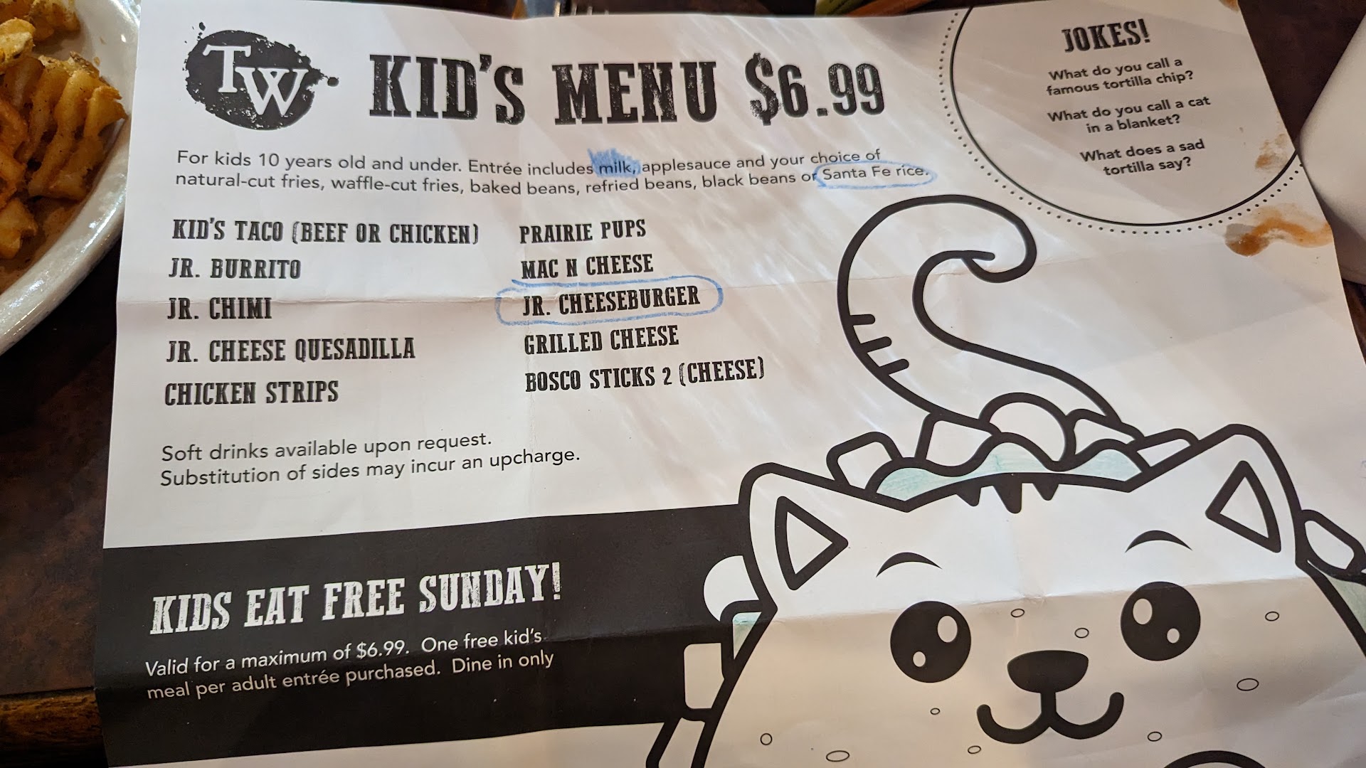 Then he just disappears, we don’t see him for a few more minutes, he comes by, says all they’re waiting on for our entrees was my steak, I ordered the chicken burrito, for reference, and then he just walks away and disappears again, there had been another table seated for him that he hadn’t even attended to during this time.