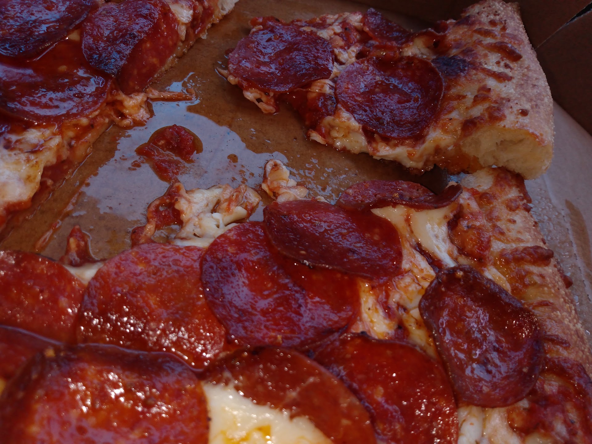 When I arrived home and grabbed a plate to get my husbandās pizza for him (I live only about 5 minutes away), the pizza looked as if it was over cooked and old instead of fresh. Tasted like it too. Pizza was not hot, which I suspected because he kept leaving pizzas sitting on the counter versus the holding box to keep food hot.