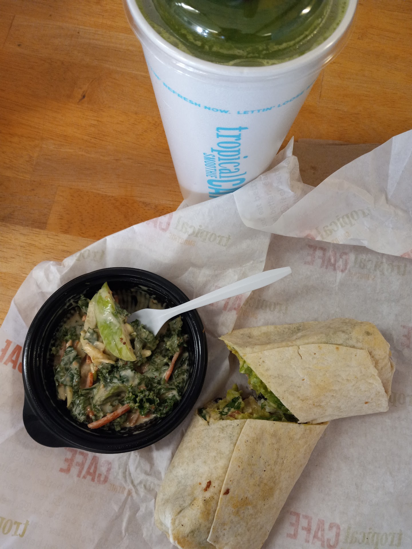 To begin with, I like tropical smoothie. This location has been steadily declining though. After today's visit, I think I'll be going to another location. We ordered online and arrived a few mins early. So we expected a bit of a wait; however, we ended up waiting an additional 18 mins. There was only 1 other customer in the store. Maybe they had a lot of online orders. The wait wasn't a big issue though. The food and smoothies were easily some of the worst I have ever had. I ordered the peanut butter paradise with strawberries, it was just blended ice. Barely enough ingredients to give it any flavor at all. My wife ordered the Acai berry boost, same thing. Super lightly colored and 90% ice. Now, the food. I ordered a Baja chicken wrap. Exactly 3 pieces of chicken, 1 slice of onion, about a tablespoon of rice and packet with lettuce. All I could taste was the wrap and lettuce. Why didn't I send it back... it was a to go order. We didn't notice until we got home. Extremely disappointed in how poorly this location is doing nowadays. Maybe I'll revisit in a couple months to give it another shot. Until then, I recommend going to...