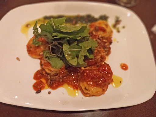 Read moreÉramos cuatro comensales y llegamos un poco tarde (22:30 hs.) en un jueves de noche. Dos de nosotros ya habíamos ido algunas veces, pero antes de pandemia, asique fue reconfortante confirmar que el fuerte de la carta siguen siendo las pastas. Tres de nosotros pedimos pasta y uno el cordero braseado con verdes y puré. En consenso grupal fue que las pastas estaban sabrosas, pero con las siguientes consideraciones. Los fetuccini mediterráneos (foto) tenían tomate, pesto de almendras (creo), alcaparras y anchoa. Aunque la anchoa estaba disuelta en la salsa, el comensal dijo que hubiese sido un lindo gesto que pusiesen una o dos anchoas enteras arriba. Mis sorrentinos eran de ricota y bondiola. Los otros comensales los probaron y dijeron que le sentían la bondiola. Yo no, pero no puedo objetar la textura y el punto de cocción – al dente. El tercer plato de pasta fue el más peculiar: fue descripto por el mozo como sorrentinos (o raviolones, perdón pero no sacamos foto) de espinaca y remolacha. ¡El asombro de la comensal fue extremo al cortarlos y ver que, si bien la masa era verde (la espinaca) adentro también eran verdes! Al preguntar al mozo dónde estaba la remolacha, dijo que se había equivocado en la descripción y que eran hojas de remolacha. No es que no se pudieran comer, pero es un detalle a considerar. De hecho, el servicio fue quizás el punto más peculiar. El mozo fue atento y amable, pero se mostraba algo lento y distraído. Supusimos que, o bien era su primera semana trabajando o estaba substituyendo a alguien que estaba de licencia (fuimos en Semana de Turismo). Quizá fue porque llegamos tan tarde nosotros. Vale la advertencia: no hay carta impresa, te acercan una pizarra con las opciones del día, los precios y el mozo explica ingredientes y contesta dudas. Un lado de la pizarra tiene la comida salada y otro las bebidas. Esto no es así para los postres en donde el mozo los recita, nuevamente, sin aclarar los precios (pero nosotros tampoco preguntamos). Pedimos sólo dos postres ya que uno de nuestro grupo no quería y otra es hipoglucémica. El restó no ofrece opciones de postres sin azúcar, pero sí tienen una opción vegana en el menú salado. Los postres que sí pedimos fueron un mousse de maracuyá (estaba correcto) y mi postre, que el mozo describió como torta invertida de frutas, manzana, pera y durazno. Lo que llegó a la mesa, a mi entender, no era una torta invertida sino un crumble: la fruta, en lugar de estar arriba (de ahí lo de “invertida”) estaba abajo, y venía acompañado de la misma salsa de maracuyá que el helado. He de puntualizar que la geometría y denominación, en este caso, no me importaron ya que, de hecho, estaba muy rico, y la textura crocante del arenado superior (de ahí que yo lo nombre crumble) era perfecta. Servicio rápido y trajeron una panera (casero, calentito y ahumado el pan) con un dip de lentejas. Las mesas son amplias y están bien espaciadas y la sala tiene un reciclaje lindo. No parecen haber muchas opciones en Cuidad Vieja para comer entre semana por la noche, asique...