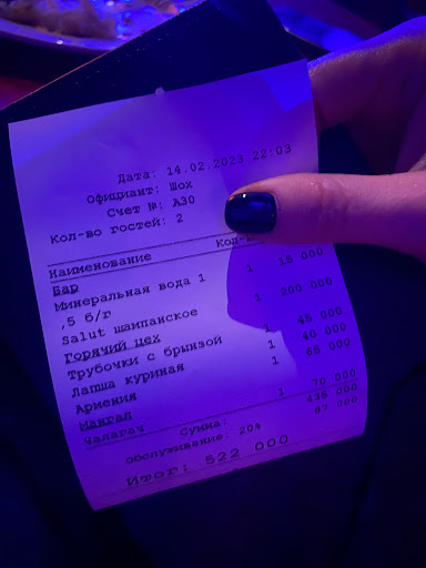 Entschuldigung, aber für mich als Deutscher ist dieses Restaurant „Mehr Schein als sein“, also Möchtegern gehoben. Wir haben Familie hier und nach all den Jahren unserer Besuche in Taschkent, war es das erste mal, dass wir sowas erleben mussten. Sowas hätte es bei uns in Europa niemals gegeben aber auch in Taschkent nicht. Dementsprechend kann ich keine Empfehlung...