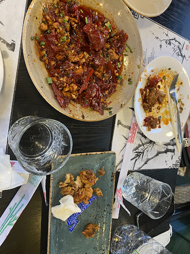 I have this one star only for the Dimsum dish we got. Other than that this restaurant does not worth to revisit or recommend to anybody! I was there today with my family. Waiters looks like they are forced to serve! No smiles and no good service. We chose outdoor table. Although the waiter cleaned it for us but he did not put anything on the table! No cutleries, no salt and pepper, no tissues! I had to ask for each one! The other waitress was shaking when she serve the food to the point I was worried she will drop the food on us! Our order came out of sequence! Soup was almost the last thing to be delivered instead of being one of the firsts. Our last dish came very late (almost one hour from the first order). We were waiting and waiting and waiting for any of the waiters to come to ask them about it and then they served it. A chicken dish (check the picture) that is full of bones and chicken skin! This plate must be boneless and skinless otherwise it is not eatable! The only dish that was good and served on time was the Dimsum. I made same complain to the manager and hope they will correct their problems before they lose...
