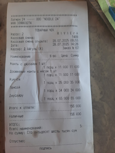 Read moreЗдраствуйтк, решили сегодня пообедать в Ривьере в Лагман 24. Заказали 4 позиции: Манты с мясом и с жусаем, подали хололные. Кукси, это вообще отдельеая история, бульон кукси был сладкий как сладкий чай, мясо видимо жарили вчера в 5 утра, и почему то с добавоением зиры. Салат "Лансай"- фунчоза была деревяной с непонятным запахом, видимо готовили так же вчера в 5 утра. Джусайру почему то всё пережарено и не свежо. Это что касаемо еды, что касаемо персонала, кассир почему то не имеет навыков этикета общения с клиентами, а персонал на кухне видимо уже слишком устал что бы вкусно готовить. В первые хотели попробовать Лагман 24, но к сожалению это будет в...