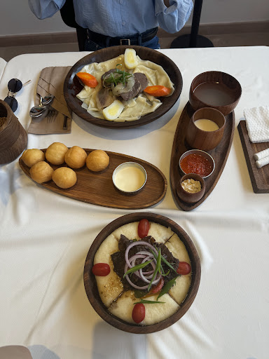 Read moreОчень красивое место, инстаграмное, чистое что не мало важно Из плюсов: еда вкусная. Кофе отличное жа свою цену (дают в качестве комплимента от заведения вафельки). Место не загруженное, людей мало, тихо и спокойно. Из минусов: Приборы которые они подают очень не удобные при использовании. Еда не горячая, она еле теплая( возникает вопрос, когда он был приготовлен) Бульон поданный к Бешбармаку был НЕнаваристый, и в комнатной температуре, хотя должен подаваться горячим. Посуда которым они пользуются при подаче деревьянные( один факт про них, за ними ухаживать очень сложно, и мыть нужно тщательно иначе запах блюд останется и со временем посуда начнет вонять.) так вот сегодня мой заказ был казан жаппы( к сожалению хлеб на дне этого блюда пропитал в себя этот запах , что мне очень не понравилось. Кстати Баурсаки с медным каймаком ван лав 🫶🏻🫶🏻 очень вкусно, но мне кажется Баурсаки чуть чуть не соответствуют реальным казахским. Они более сдобные а должны были быть почти пустышкой. Очень...