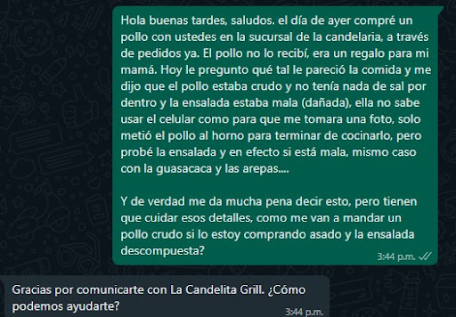 Read moreYo fui un cliente habitual de la Candelita de la Sede de La Candelaria, realmente era un sitio que me gustaba ir con mis amigos a compartir, la comida siempre fue buena, dejé de frecuentar el sitio por motivos varios, sin embargo hace poco vi que tenían una promoción de pollo asado en Pedidos YA y quise tener un detalle con mi madre y le compré un combo y se lo mandé a su casa. Mi mamá por educación no me dijo varias cosas que tenía el pedido, entre ellas, ensalada fermentada, guasaca dañada, arepas con sabor ácido, el pollo completamente desabrido y de paso crudo... El día de ayer me comuniqué con ustedes expresando mi incomodidad y me dejaron en visto, y el motivo del cuál estoy dejando esta crítica es porque gracias a ustedes TODOS en la casa porque yo también comí el famoso pollo (1 día después), tenemos diarrea. NOS CAYÓ MAL LA COMIDA...
