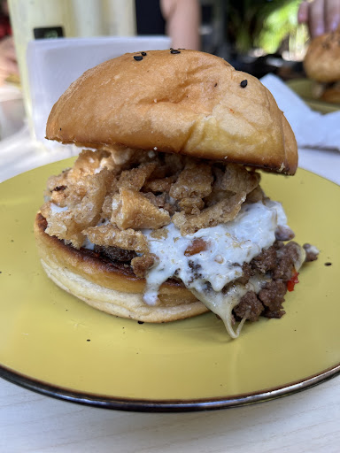 Bueno, vamos a empezar. Desde hace varios días queríamos probar la Cocuy Burger participante en La Copa de @qlqestacomida. Por WhatsApp, esta gente no responde, te deja esperando, no te informa si hacen delivery o si el restaurant está lleno o vacío. Simplemente te ignoran, entiendo que estén complicados, pero es deber del restaurante resolver sus problemas logísticos si va a participar en un evento de este tipo. Por supuesto, insistimos en probar la hamburguesa, así que decidimos ir al local, y para nuestra sorpresa y desagrado, tuvimos que hacer un poco más de una hora de cola para sentarnos, por supuesto, escuchando a un DJ a niveles de volumen altísimos, totalmente fuera de contexto en Plaza Las Américas. Había mesas libres, pero al sol, y como todo está al descuido, había espacios con sombra a los cuales se podían llevar esas mesas, cosa que tuve que hacer yo mismo. Cuando finalmente nos sentamos en la terraza externa, el sol fue inclemente, esto no fue culpa del restaurante, pero de igual manera fue incómodo. Cuando finalmente nos tomaron la orden, el muchacho estaba MUY confundido, se ve que era nuevo. No sabía usar la tablet para los pedidos, nunca supo lo que era una Minalba Sparkling, y no sabía lo que contenía su parrilla individual. Se demoró muchísimo para tomarnos el pedido, cosa que explica la demora en la cola. Se les van acumulando comensales a medida que pasan las horas. La hamburguesa estaba sabrosa, la novedad de el flambeado es divertida. El chicharrón estuvo sabroso pero se sentía como aislado, no se siente una cohesión de ingredientes, eso si, la salsa de queso de cabra funcionó muy bien. Pero por nada del mundo es una hamburguesa para esperar una hora, y habiendo probado muchas de las hamburguesas de La Copa, no está ni siquiera en mi TOP 3. No creo que volvamos a darle una segunda...