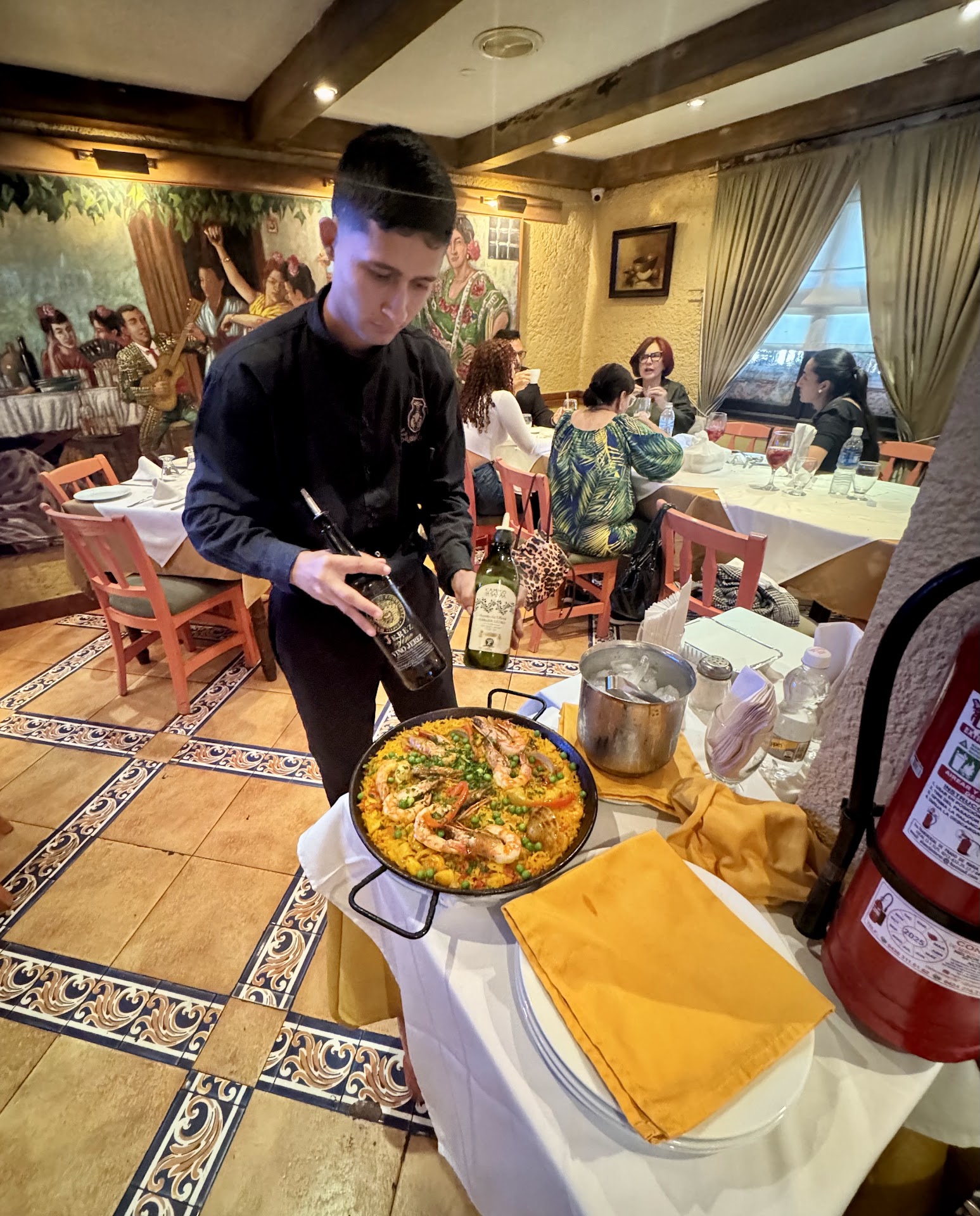 La atención es impecable. El personal combina profesionalismo con una hospitalidad genuina que te hace sentir en casa. En la imagen, uno de los camareros sirve con elegancia una paella de mariscos recién salida del fuego: generosa, aromática, con mariscos frescos y ese toque dorado que delata un buen socarrat en el fondo.