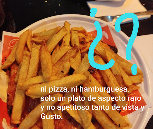 Read moreHonestamente las pizzas me parecen bien, las ensaladas y pastas también, el ambiente funciona, sin embargo... Una cosa. ojalá esté comentario llegué a alguien que influya directamente en la preparación de la PIZZABURGUER , porque de verdad es MALISIMA, o no sé si yo tuve la mala suerte de pedirla en un momento de malas del cocinero. Empezando por el aspecto. que de hecho me la sirvieron como camuflada en papas para disimular el aspecto raro, lo otro la sirven en un papel que se pega totalmente a lo que se supone que es comida, y bueno sentí que me comí un pastelito de carne sancochada insipida gigante, jugoso (no en el buen sentido) con queso quemado por los lados, hace tiempo ví que se la sirvieron a alguien y no se parecía nada a lo que comí. No debí pagar por eso, pero ya tenía más de 30 min esperando para esperar más :( devuelvanme mi plata!! Ah se me olvidaba, la cajera no me dió factura, supongo que es parte de sus estrategias chanchullera de ganancias, junto con que cobran los productos en euros porque seguramente ellos importan las salsas y harinas de...