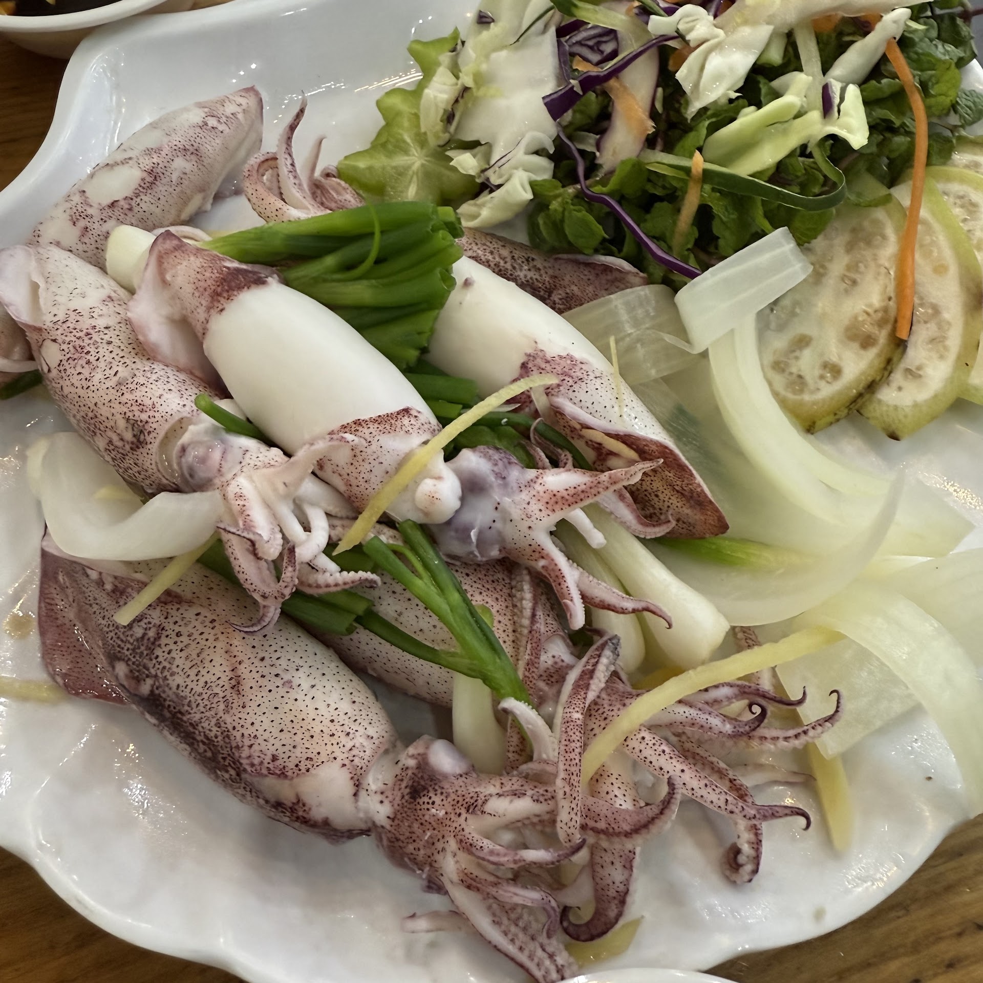 The squid's viscera is not cleaned; it's still quite dirty inside. The tiger shrimp is not fresh enough; it seems to have been dead or nearly dying when it was boiled. We brought these issues to the waiter, but no one seemed to care.