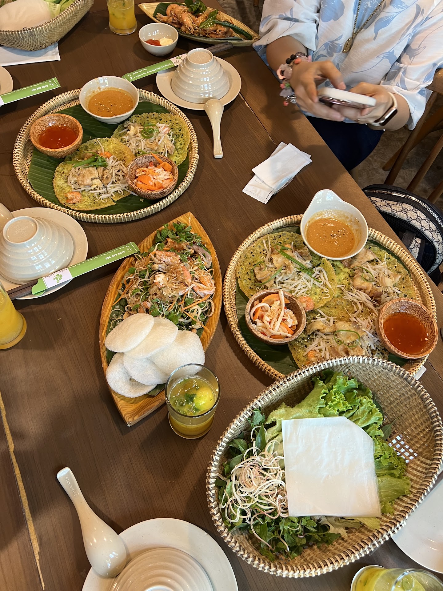 The Food: The travel Agency ordered the food for us. The menu focuses on classic central Vietnamese dishes, particularly those featuring "bep cuon," which translates to "rice paper rolls." We started with their signature platter, a perfect way to sample a variety of fillings. Each bite was a symphony of textures and flavors, with fresh vegetables, perfectly cooked meats and seafood, and a delicious dipping sauce. We also tried the Banh Xeo, a crispy turmeric pancake which was my personal favorite. The Passion Fruit Juice was also very refreshing!