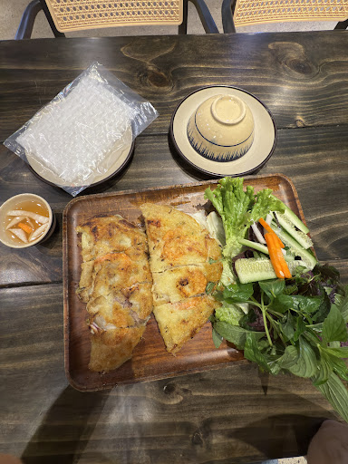 Firstly, the banh xeo although crispy, lacked a lot of flavour. To compensate, you would typically dip with Nuoc mam (fish sauce) but they give you a small little dish with approx 30 Mls. With the banh xeo, they give you a side of salad but it is barely enough to eat any of the banh xeo with. You may think, just order more, we did, however service was slow where it took over 10 minutes to get 3 more pieces of lettuce. The business only had three tables and a bunch of staff talking behind the counter. The mango smoothies were sour and near tasteless instead of being sweet. Look, these complaints would be fine if the price point was low but it is excessive at around 800-900k dong to feed three people, for four mains and drinks. Considering you can get banh xeo for a fraction of the cost along with the other dishes we ordered on the street or other local eateries, it kinda feels like a restaurant for tourists too afraid to venture into the local restaurants. These reviews they got are either bought or from naive and inexperienced tourists who have yet to venture out of their comfort zone. I am actually saddened I wasted money here.