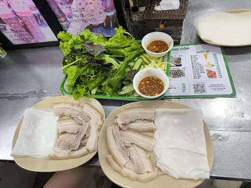 Theo chân review các tiktoker thì mình tìm đến quán Bi Mỹ để ăn bánh tráng cuốn thịt heo. Với trái tim vô cùng yêu đồ ăn, mình bước vào chợ thì có một khu xây riêng cho các hàng ăn, trông rất sáng sủa và vệ sinh, 10 điểm đầu tiên. Mình tìm thấy quán Bi Mỹ nằm ở cuối cùng.