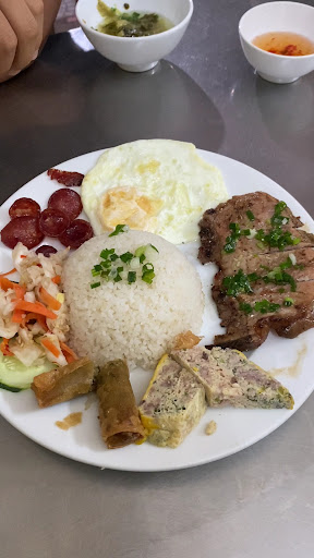 The grilled pork chop is the star of the show: tender, juicy, and charred just right for that authentic smoky flavor. Their egg meatloaf (chả trứng) and shredded pork skin (bì) are also solid choices, full of texture and traditional taste. The broken rice itself is fluffy and perfectly cooked, soaking up the savory, slightly sweet nước mắm like a sponge.