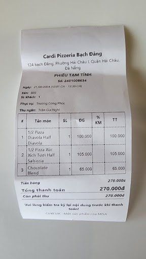 Good pizza using premium toppings and quality cheese. The dough was decent, but I have had better. The iced chocolate blended drink was very good. They accept credit cards, including contactless tap and pay digital wallet payments via phone (i.e., NFC mobile payments), without any annoying surcharges, which I like. They have streetside outdoor seating and indoor seating upstairs with some aircon. The seating is tight with tables spaced very close together. There is a small washroom located upstairs. Unfortunately, they are not honest with regard to pricing. I was told I could do half and half with the speciality pizzas, so I ordered half Divola and half Salsiccia. When the bill came, they correctly charged VND 100k (half of VND 200k) for the Divola, but instead of charging me VND 95k (half of VND 190k) for half the Salsiccia, they charged me VND 105k. I asked about this error, and they told me to wait while they call the owner. After a few minutes, I just gave up waiting and paid the overpriced bill. They then told me that whenever you order half and half that there is a VND 10k charge, which is false since that isn't disclosed on the menu and it would otherwise appear on the bill that way; not as an inflated price on just one half of the pizza. It's only VND 10k, but what a dumb way for a business to lose a customer over such a small amount. Next time, just acknowledge your error, honor the menu prices, charge customers the proper amount, and resolve the internal issues at close of business. Nearby 4P pizza offers a much better experience (and pizza); I suggest you go there if in the mood for quality pizza and...