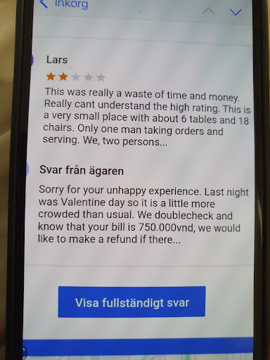 Verdict: We just wanted to leave as soon as possible. 800 000 dong should have been a good deal if food was according to previous reviewers but it was not. Now wasted away except for the very nice and balanced dressing in the cucumber salad.