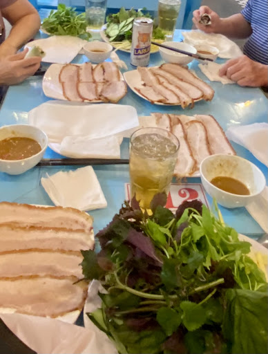 My husband and I just absolutely love the roasted pork, thinly sliced with a hint of crispiness from the pork skin. We can't say enough good things, especially with the spicy and deliciousness of stinky fermented shrimp paste sauce that makes my mouth water just thinking about it!