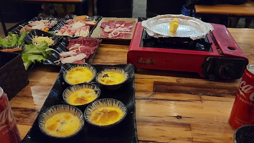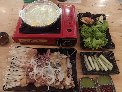 Xong zô kêu món. Lẩu nướng Hàn cuốc "ăn ko kịp cmn thở" gì đó 199 cành. Lên đc mấy cuộn bò mỹ, mấy bạch tuộc mini, vài cục thịt bò kích thước nửa cm, một đĩa rau duy nhất bé tẻo sau đó kiu chín chục lần ko có đĩa thứ hai =)))