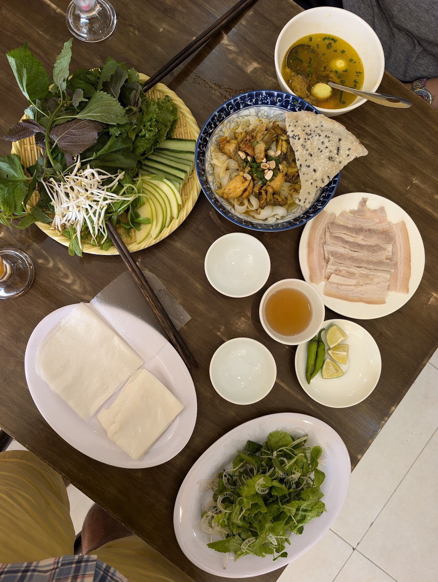 They specialize in a local dish that consists of rice paper, rice noodles, a nice heap of mixed greens and herbs, and a side of boiled pork belly. You roll this all up together and dip it in fish sauce and voilà, a heavenly and beautifully balanced and absolutely scrumptious explosion happens in your mouth as you chew and slowly swallow what nature has given you.