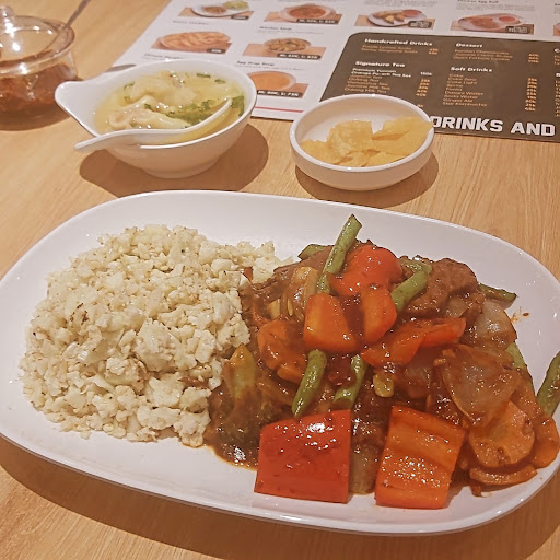 Main dish is not rice, so of course i disappointed. Also I have to eat it with fork and spoon. The dish is Szechuan (sichuan?) Beef Cauliflower Rice. It is more like Beef steak with salad. It have dried pepper made it spicy, but only spicy as hell when you eat that piece of dried pepper in the dish, or else the dish is super sweet.