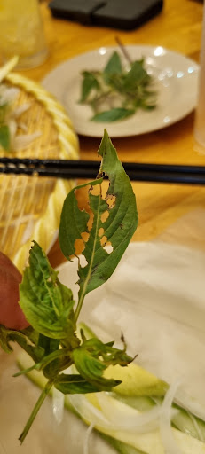 The only minor disappointment was the herbs provided with the skewers and banh xeo. The herbs provided were cilantro and basil but no mint. When we asked for mint using Google translate, we were told there is mint and they brought us more cilantro and basil. Not a problem as the food was tasty enough but the new plate of herbs had been half consumed by other creatures (see pic)